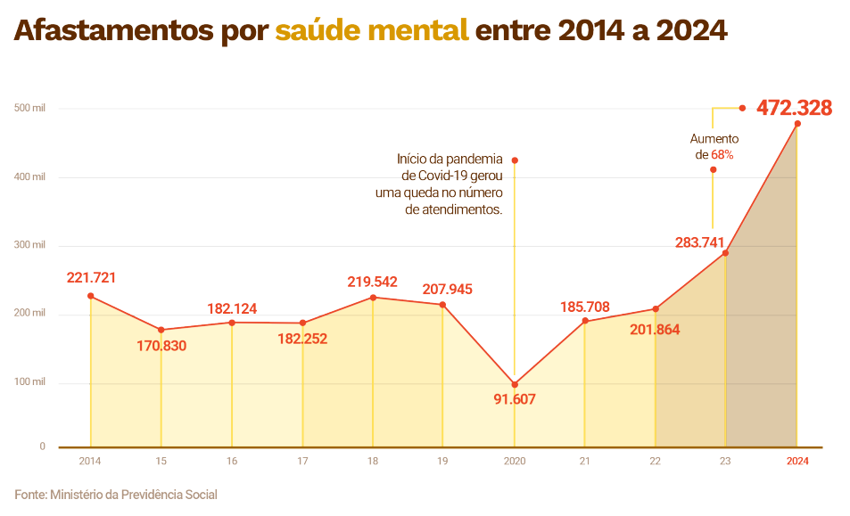 Com base nas informações do Ministério da Previdência Social, a Caju elaborou o Índice de Bem-Estar e Saúde Mental da Caju, que traz um gráfico sobre o crescimento do número de afastamentos por saúde mental entre 2014 a 2024. Veja: