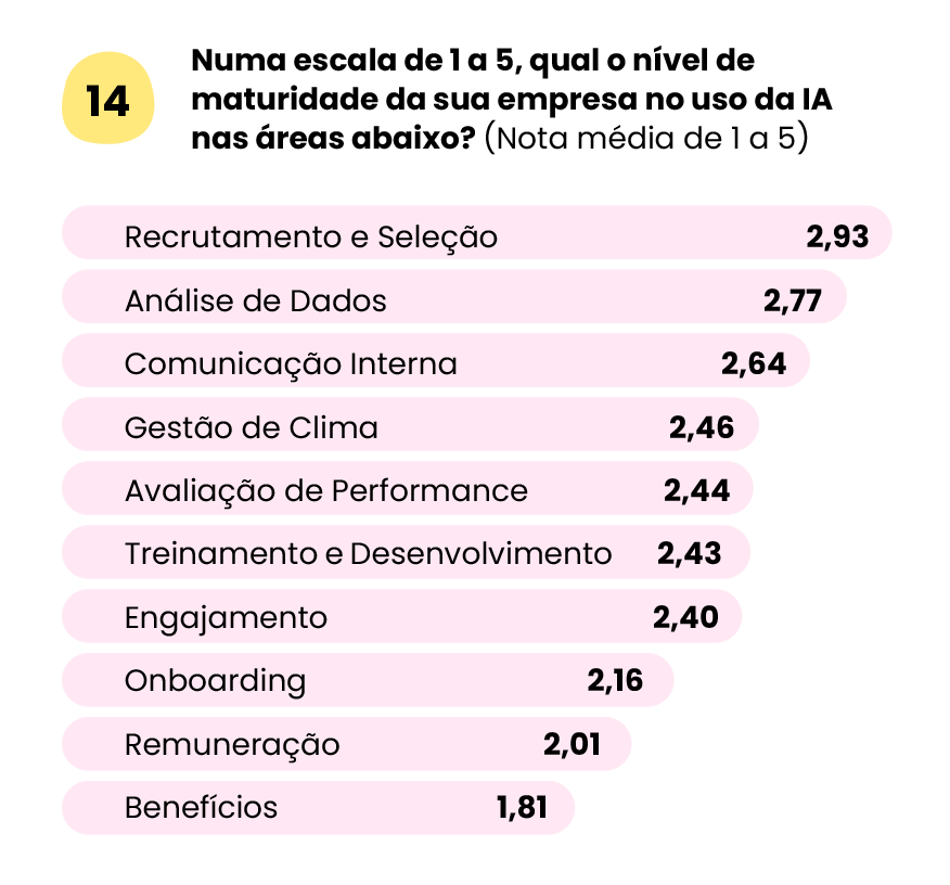 Apesar do avanço, a pesquisa mostra que o nível de maturidade no uso da IA ainda é considerado baixo ou médio na maioria das áreas do RH. Isso indica que muitas empresas estão em fase de experimentação, utilizando a tecnologia de forma pontual, sem integração total aos processos.