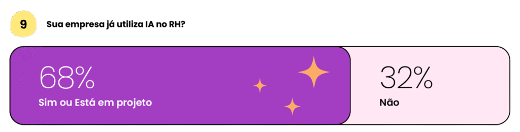 Segundo o levantamento, 68% das empresas já utilizam ou estão testando soluções de IA no RH. Em organizações com mais de mil colaboradores, esse número sobe para 82,6%, indicando que a tecnologia já faz parte da agenda estratégica das grandes empresas.