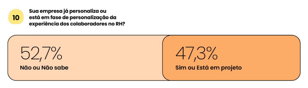 A partir desse primeiro passo, a personalização se expande para outros pontos da jornada, como Recrutamento e Seleção (56,7%), T&D (54,6%), Onboarding (53,6%) e Comunicação Interna (44,3%). Isso mostra que, quando a empresa compreende o impacto da experiência individual, tende a levar essa lógica para outras etapas.