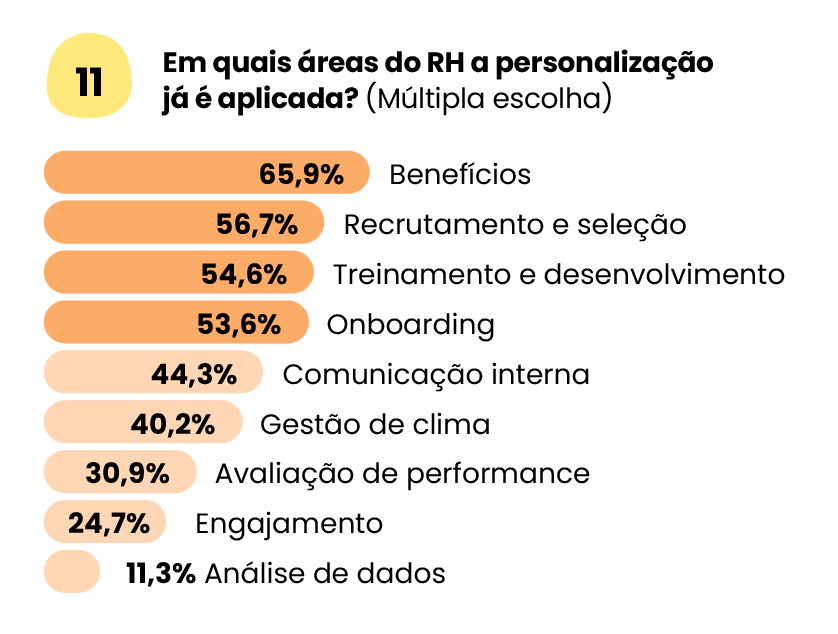 Entre as empresas que já personalizam, a prática aparece primeiro nos benefícios corporativos. De acordo com o relatório, 65,9% dos respondentes afirmam personalizar nessa área. E esse protagonismo não é por acaso.